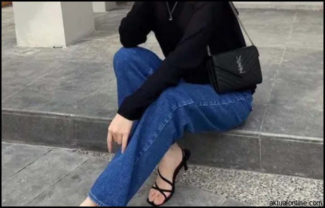 Berpadu dengan denim biru adalah pilihan aman tetapi tetap modis. Warna biru pada denim memberikan kontras yang halus dengan baju hitam, menciptakan tampilan casual namun tetap elegan.